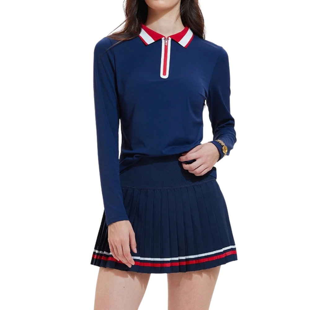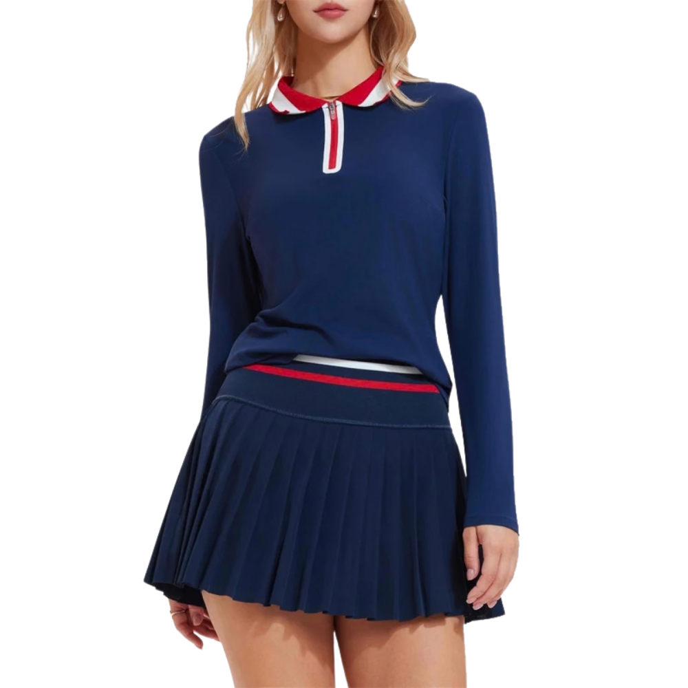 Crafted from a high-performance blend of 91% nylon and 9% spandex, this outfit ensures you move as freely as you look good. The practical front zip long-sleeve polo allows for easy adjustment, while the comfortable high-waist pleated skirt offers secure support during fast-paced games.